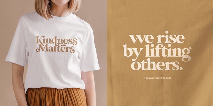 Due to its split personality , glamour absolute is a very versatile font, covering a wide range project types, from bold magazine imagery , to wedding invitations, to branding.
